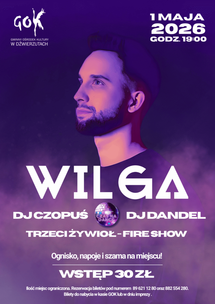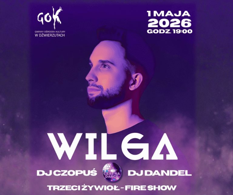 Zapraszamy na wyjątkową majówkową imprezę „Czas na Dance”, która odbędzie się 1 maja 2026 roku o godzinie 19:00 w Dźwierzutach. Przed nami wieczór pełen muzyki, energii i doskonałej zabawy, którego gwiazdą będzie Wilga.