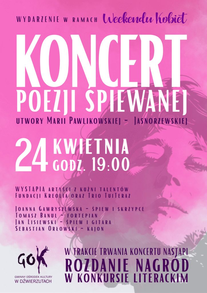 W ramach Weekendu Kobiet serdecznie zapraszamy na wyjątkowe wydarzenie artystyczne – Koncert Poezji Śpiewanej, podczas którego usłyszymy utwory Marii Pawlikowskiej-Jasnorzewskiej w niezwykłych muzycznych aranżacjach. To będzie wieczór pełen emocji, pięknych tekstów i nastrojowej muzyki.