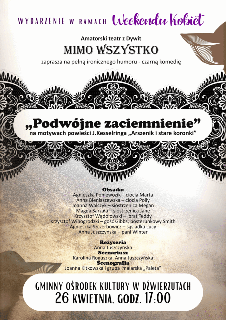 Artyści zaprezentują czarną komedię „Podwójne zaciemnienie”, przygotowaną na motywach powieści J. Kesselringa „Arszenik i stare koronki”. Widzowie mogą spodziewać się błyskotliwego humoru, zaskakujących zwrotów akcji oraz doskonałej gry aktorskiej.